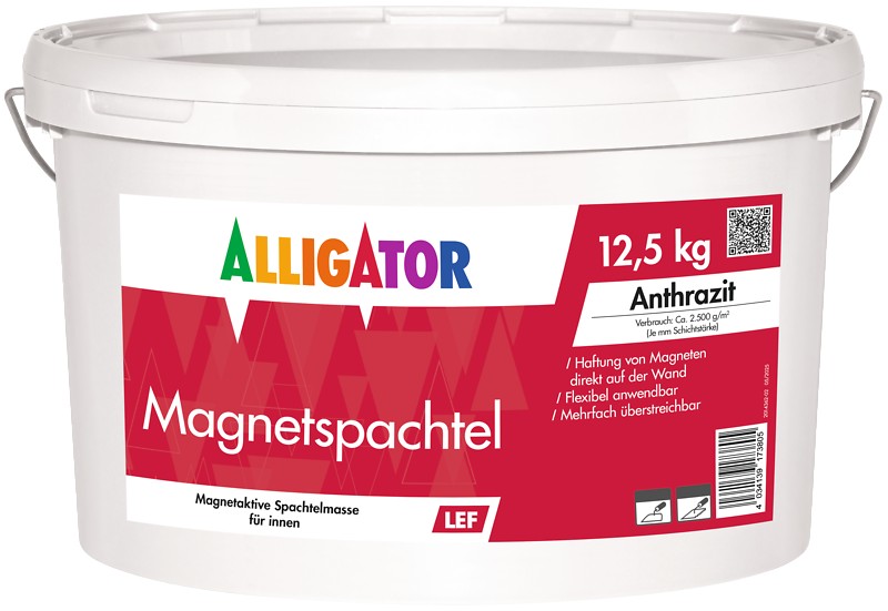 Verarbeitungsfertige Spachtelmasse auf Dispersionsbasis für die Erstellung magnetaktiver Wandflächen zur Befestigung von Plänen, Karten und Notizen im Innenbereich.