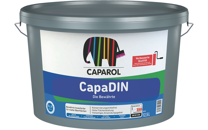 Ein satter, gleichmäßiger Anstrich mit CapaDIN, mit max. 5 % Wasser verdünnt. Auf kontrastreichen Flächen kann ein vorheriger Grundanstrich, mit max. 10 % Wasser verdünnt, erforderlich sein. Auf unterschiedlich saugenden Untergründen ein Grundanstrich mit Haftgrund EG.