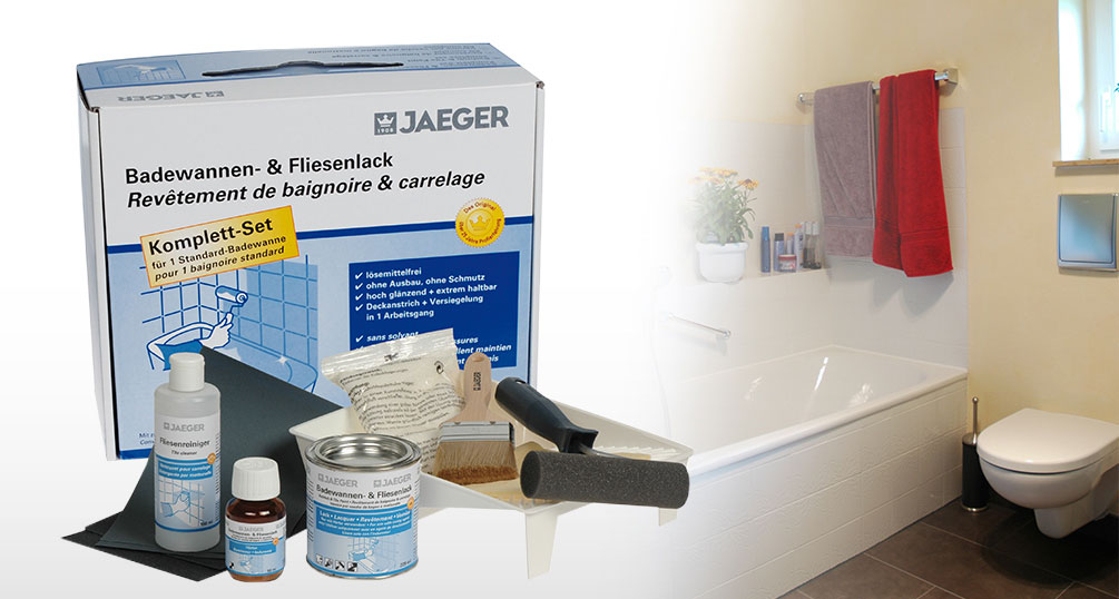 Das Auswechseln der Badewanne ist arbeitsaufwändig, verursacht Schmutz und Lärm und erfordert vielfach den Fachhandwerker. JAEGER Badewannenlack ist dazu die echte Alternative: Nach der Beschichtung, die einfach aufgestrichen wird, sieht die Wanne aus wie neu und ist so widerstandsfähig wie das Original – auf Jahre!