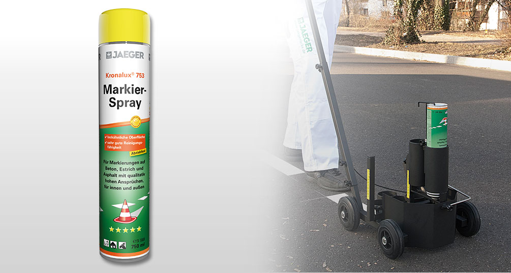Die Verarbeitung von Kronalux® Markierungsspray erfolgt mit dem Jaeger Markierungswagen. Der Markierungswagen hat eine variable Strichbreite von 50-120 mm.