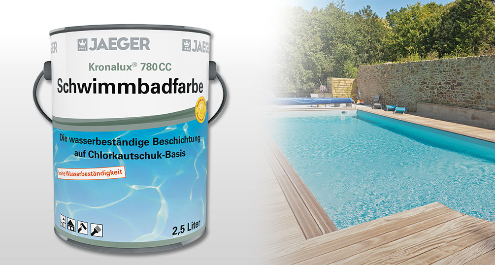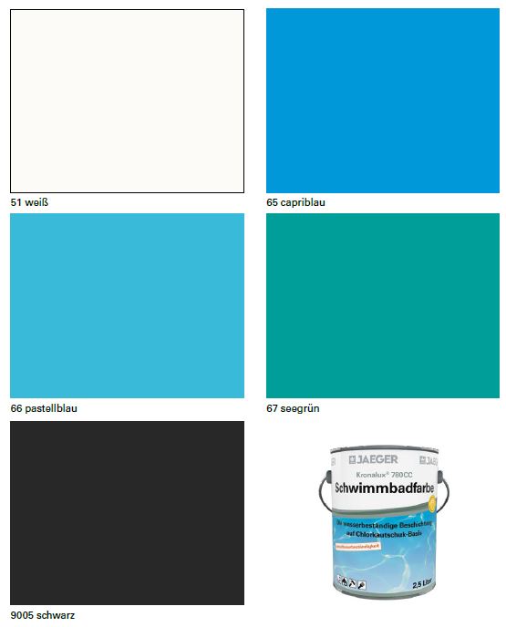 Kronalux Schwimmbadfarbe ist ein farbenfroher Unterwasseranstrich auf Chlorkautschukbasis für mineralische Untergründe wie Beton, Faserzement etc. Damit schützen und gestalten Sie z.B. Schwimm- und Planschbecken, Fischteiche und Zierbrunnen. Sie verfügt über eine hohe Wetter- und Wasserbeständigkeit und ist zudem beständig gegen verdünnte Säuren und Laugen, gegen Salzlösungen, ozonisiertes und gechlortes Wasser sowie gegen Mineralöle. Die neue Modefarbe in dieser Saison ist übrigens schwarz! Außerdem gibt es Kronalux Schwimmbadfarbe natürlich wie gewohnt in weiß, capriblau, pastellblau und seegrün.
