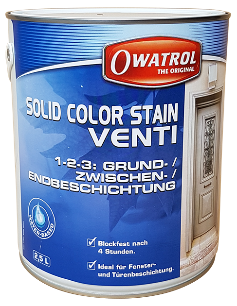 SCHNELLTROCKNENDER FENSTER UND TÜRENLACK Eigenschaften SOLID COLOR STAIN VENTI ist ein äußerst schnell trocknender, sehr schnell blockfester Holzanstrich auf Acryl-Alkyd-Basis und ergibt seidenglänzende Oberflächen. OWATROL- inside Technology sorgt für gute Haftung und sehr gute Verarbeitungs- und Verlaufeigenschaften. Enthält Filmschutz gegen Pilzbefall.