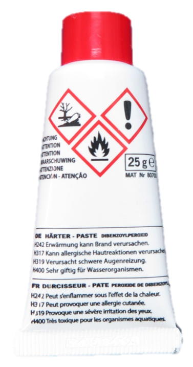 Die presto Härter sind geeignet für alle Polyesterspachtel-Typen. Es handelt sich um eine Benzoyl-Peroxid-Paste. Selbstentfärbend.